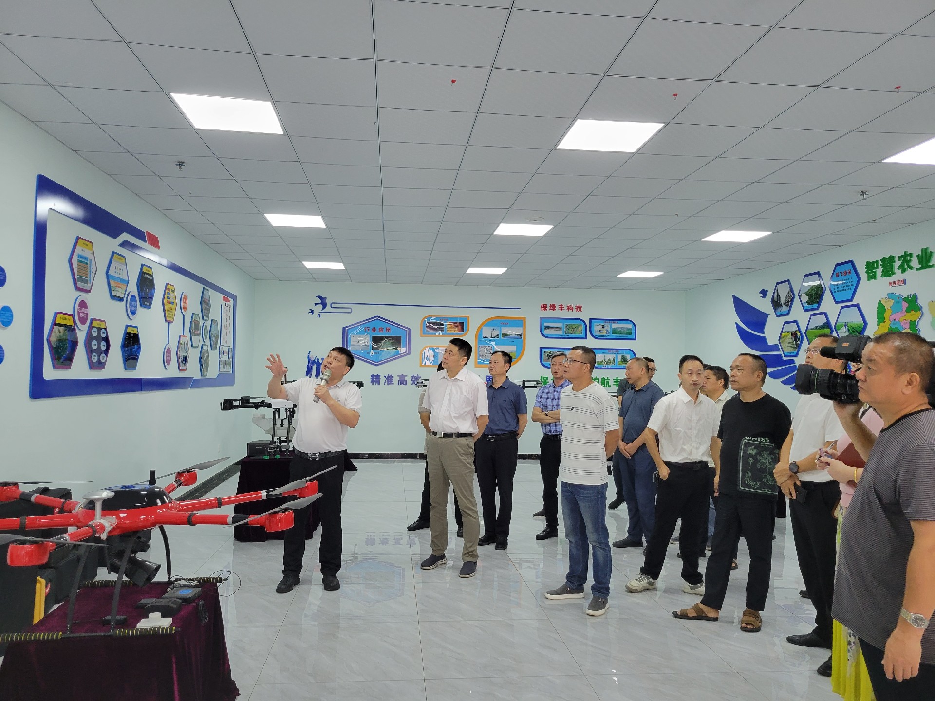 在精飛智能展廳,精飛集團董事長龍永堅向調(diào)研組一行匯報了企業(yè)生產(chǎn)經(jīng)營、技術研發(fā)、產(chǎn)品銷售等情況,其中重點講解了無人機數(shù)字農(nóng)業(yè)服務應用示范建設項目及自主開發(fā)的全國首個“北斗+無人機數(shù)字農(nóng)業(yè)綜合應用與公共服務”平臺運營情況。