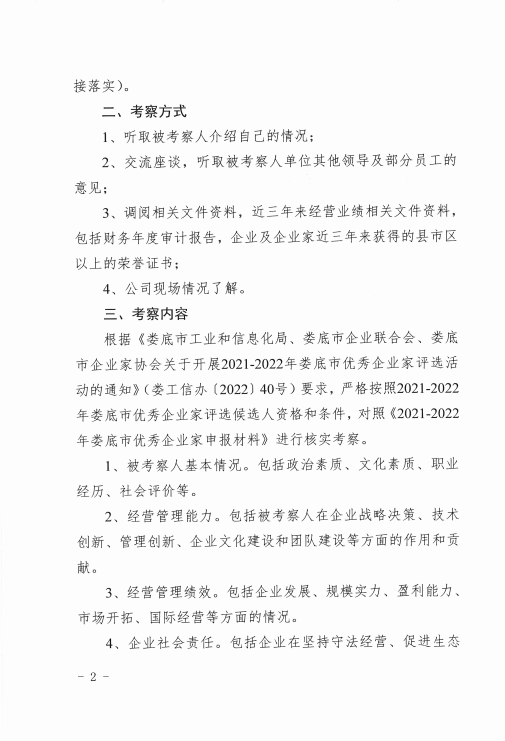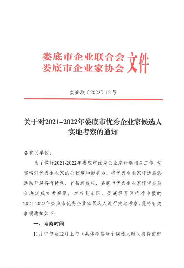 關于對2021-2022年婁底市優秀企業家候選人實地考察的通知