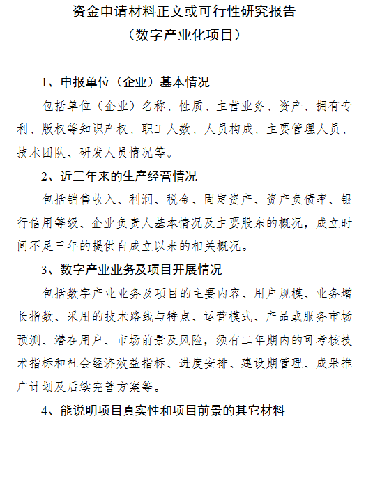 (1)數字產業化項目。申報主體為服務業企業的,要求2022年營業收入應在1000萬元以上、且當年稅收在10萬元以上,優先支持規模以上企業;申報主體為制造業企業的,應為規模以上工業企業、且2022年稅收在100萬元以上企業,優先支持具有兩化融合管理體系貫標認證資質的企業。