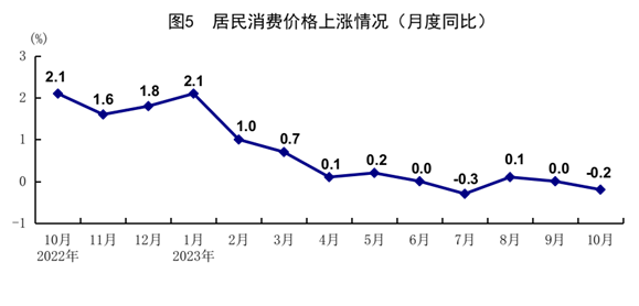 10月份,全國(guó)居民消費(fèi)價(jià)格(CPI)同比下降0.2%,環(huán)比下降0.1%。分類(lèi)別看,食品煙酒價(jià)格同比下降2.1%,衣著價(jià)格上漲1.1%,居住價(jià)格上漲0.3%,生活用品及服務(wù)價(jià)格下降0.6%,交通通信價(jià)格下降0.9%,教育文化娛樂(lè)價(jià)格上漲2.3%,醫(yī)療保健價(jià)格上漲1.3%,其他用品及服務(wù)價(jià)格上漲3.6%。在食品煙酒價(jià)格中,豬肉價(jià)格下降30.1%,鮮菜價(jià)格下降3.8%,糧食價(jià)格上漲0.6%,鮮果價(jià)格上漲2.2%。扣除食品和能源價(jià)格后的核心CPI同比上漲0.6%。1-10月份,全國(guó)居民消費(fèi)價(jià)格同比上漲0.4%。